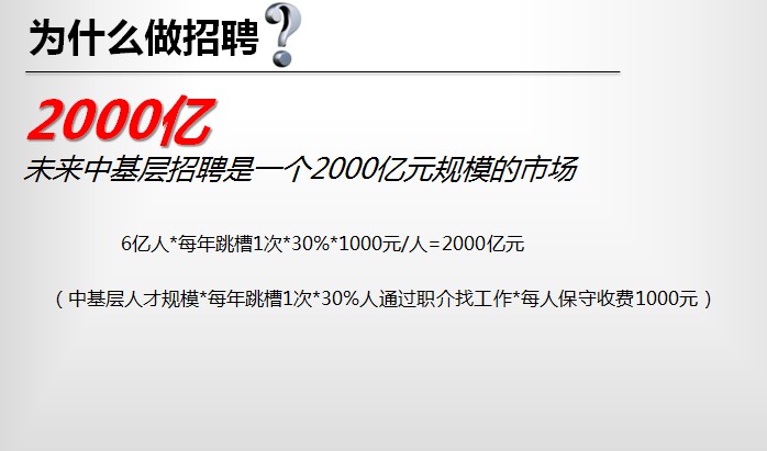 现在要通过传统线下职介招人,每推荐一个人到岗大概是1000元,所以,我觉得这是互联网带来的一个巨大的变化。