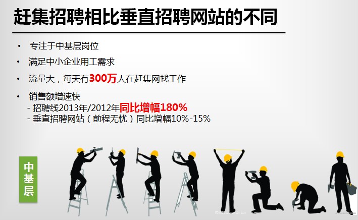 我们为什么认为现在时候也到了?第一,随着互联网的扩张,越来越往下走,越来越多的人通过移动已经开始在互联网上找工作,这种规模和趋势非常明显。我们去年全年增速是180%,前程无忧的增速大概是10-15%,很明显的趋势在往基层、在往下走。我们每天的简历数已经是他们的4、5倍了。按照销售规模去算的话,如果看上市公司财务报表,前程无忧去年线上招聘收入预计在10亿左右。而赶集在线招聘业务今年三月份预期的收入,是8000万。